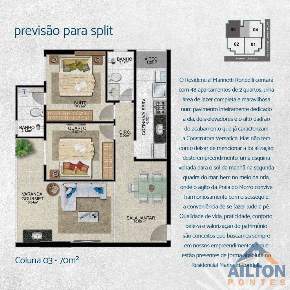 Residencial Marinetti Rondelli. São 4 apartamentos por andar, todos de 2 quartos (1 suíte) num total de 12 pavimentos de apartamento. Área de lazer completa acima do último pavimento de garagem. Localização sensacional, na segunda quadra do mar, na esquina atrás da feira de verão "shopping Praia do Morro". Condição especial direto com proprietário.