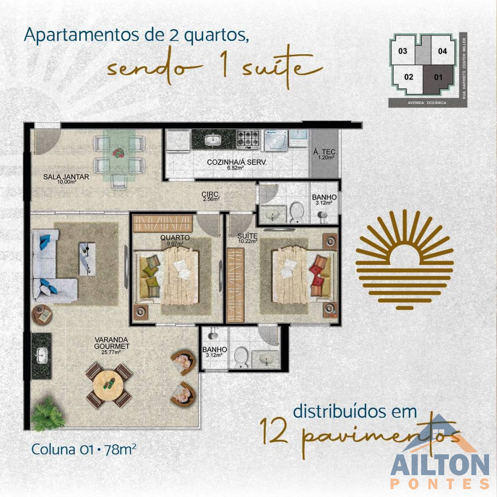 Apartamentos de 70,00 a 78,00 m², com 2 quartos, sendo 1 suíte, com 1 ou 2 vagas de garagem.