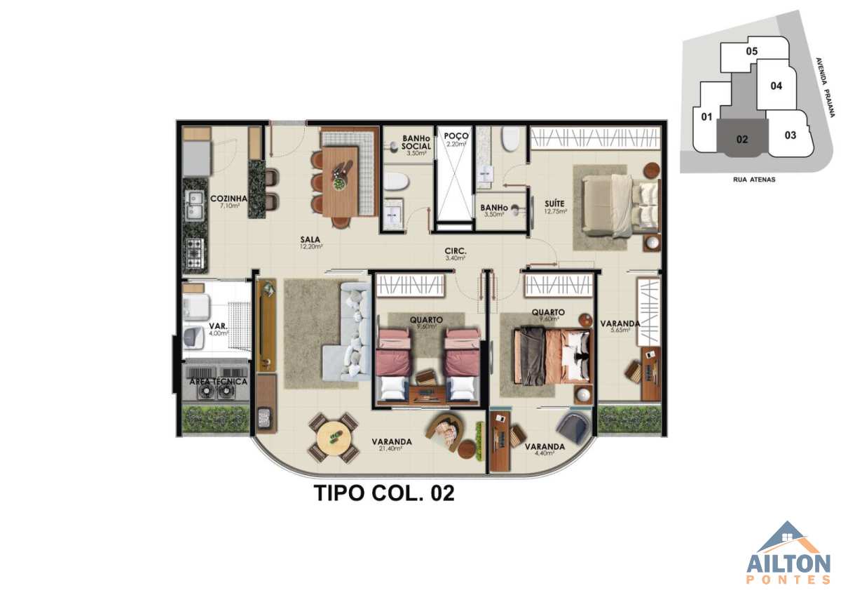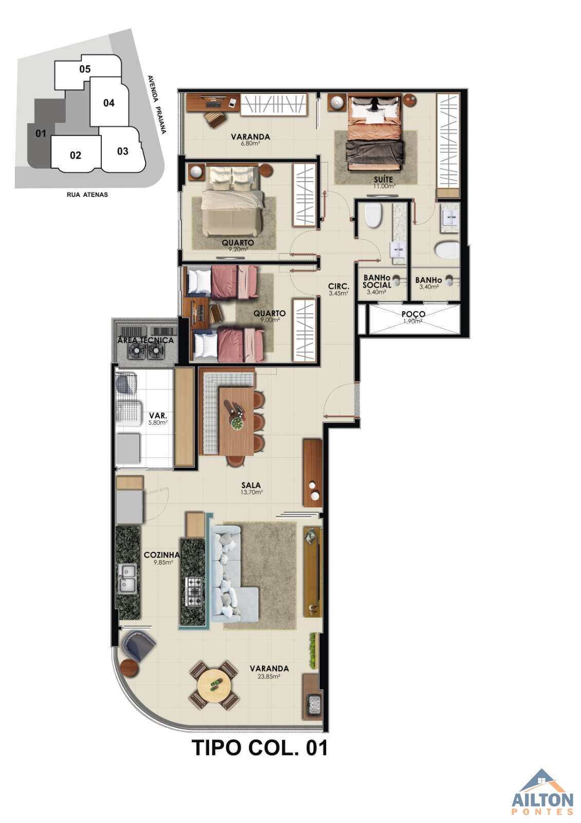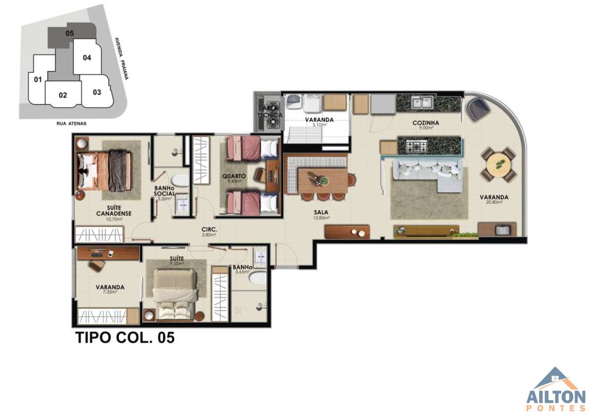 Área total de 128,35m² e 103,35m² de área útil;